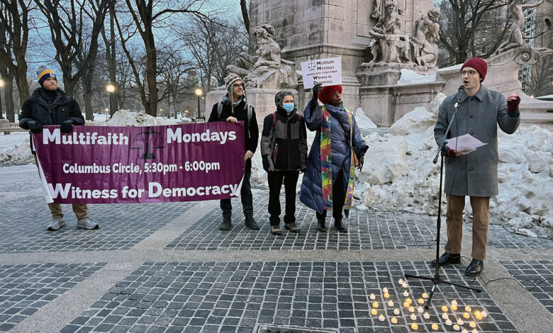 NEW YORK (RNS) — On a recent Monday evening as commuters hurried past, a group of faith leaders set out a microphone and battery-run candles at the Columbus Circle entrance of Central Park in Manhattan for their weekly prayer vigil and held up a worn-out banner reading “Multifaith Monday: Witness for Democracy.”
