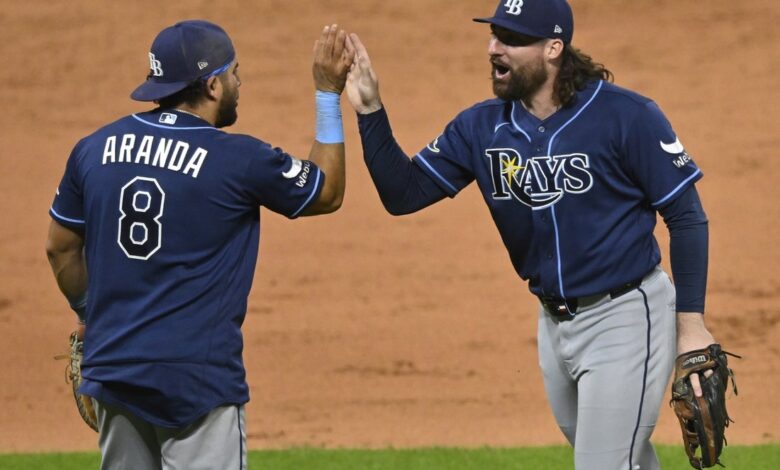 Apr 27, 2026; Cleveland, Ohio, USA; Tampa Bay Rays first baseman Jonathan Aranda (8) and right fielder Ryan Vilade (26) celebrate a win over the Cleveland Guardians at Progressive Field. Mandatory Credit: David Richard-Imagn Images Ryan Vilade had brief stints with four teams during his first three seasons in the majors. The 27-year-old outfielder looks as if he finally has found a home with the Tampa Bay Rays.